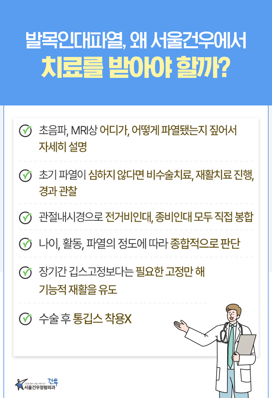 발목인대파열은 일상 생활에서 자주 발생할 수 있는 부상이지만, 적절한 관리와 치료를 통해 더 심각한 문제를 예방할 수 있습니다. 발목 부상에 대한 초기 대처가 그 후의 회복에 큰 영향을 미치기 때문에 부상 시 주의를 기울이는 것이 중요합니다. 발목인대파열은 빠른 치료가 필요한 부상 중 하나이니, 부상 시 주변 상황을 면밀히 살피고 적절한 조치를 취하는 것이 중요합니다.