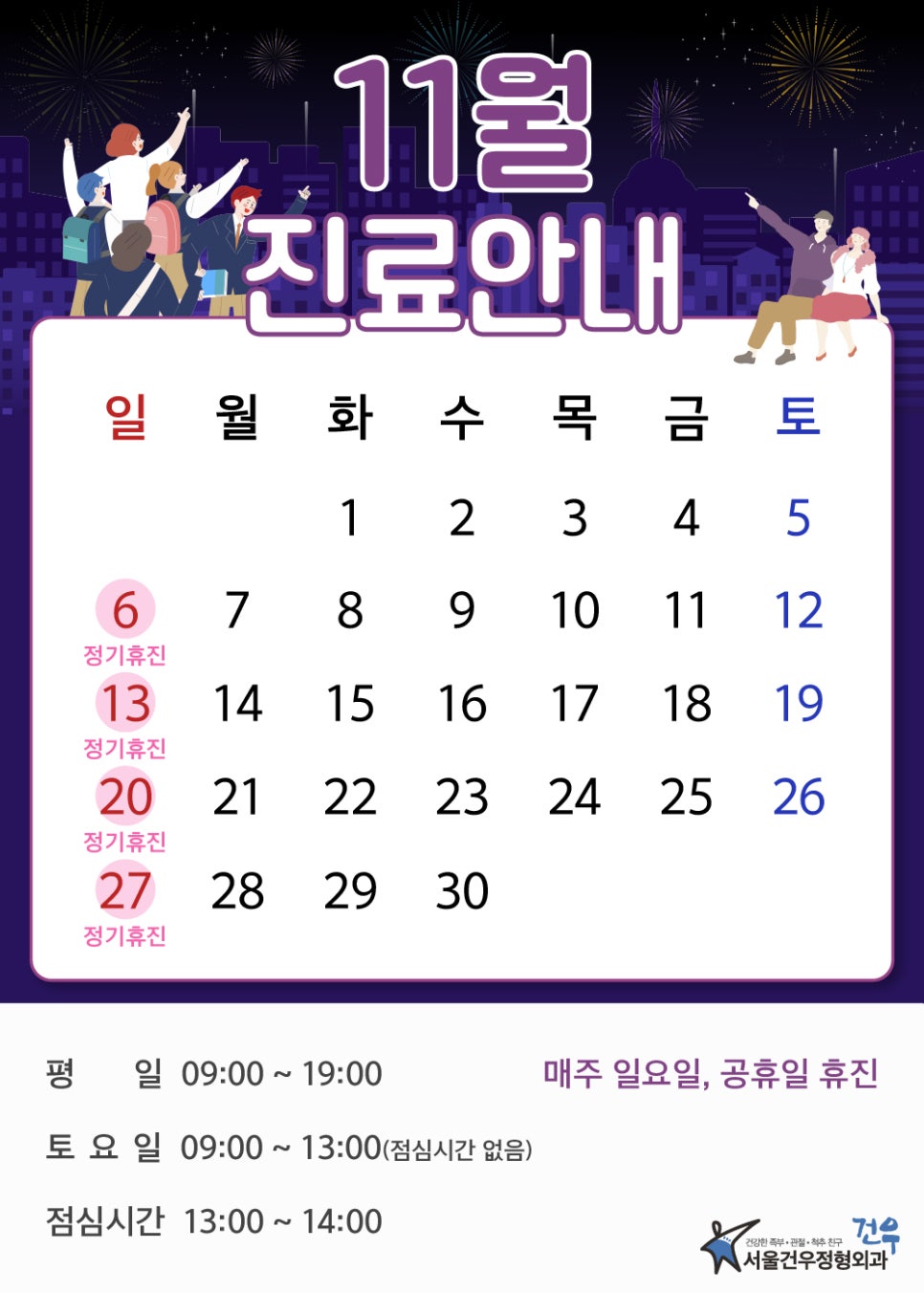 서울건우정형외과의원에서 11월에 실시할 진료 일정을 안내드립니다. 서울건우정형외과의원은 전문 의료진과 첨단 시설을 통해 환자들에게 최상의 의료 서비스를 제공하고 있습니다.