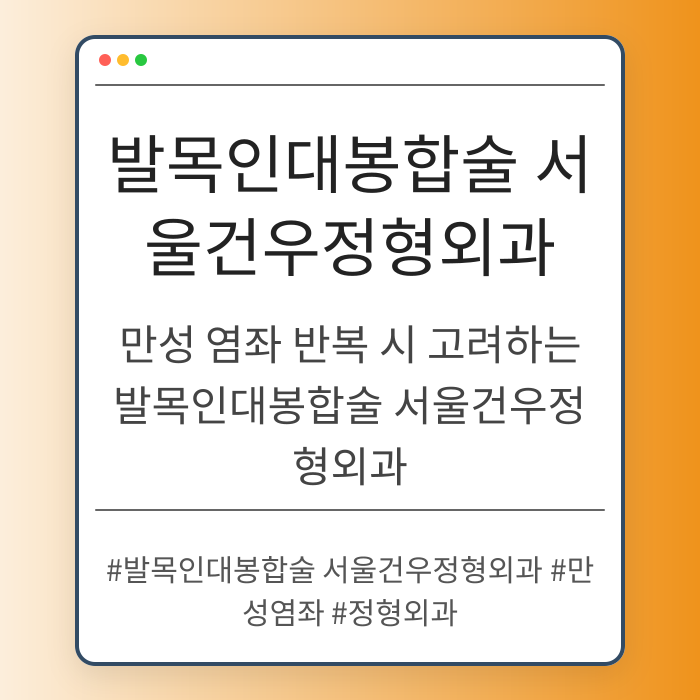 발목인대봉합술 서울건우정형외과은 만성 염좌와 관련된 문제를 개선하는 중요한 수술적 방법입니다. 서울건우정형외과의원에서는 발목 재건을 통해 환자의 생활 질을 향상시켜 나가고 있습니다.